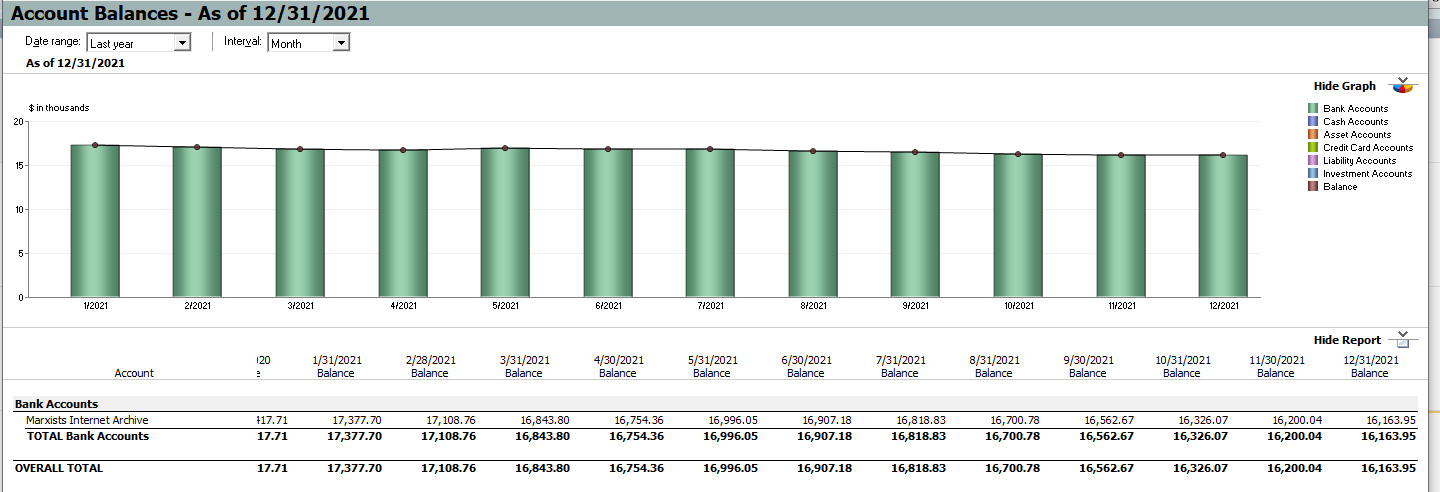 We started 2021 with US$17,417.71 in the bank. Our year-end bank balance was US$16,163.95.