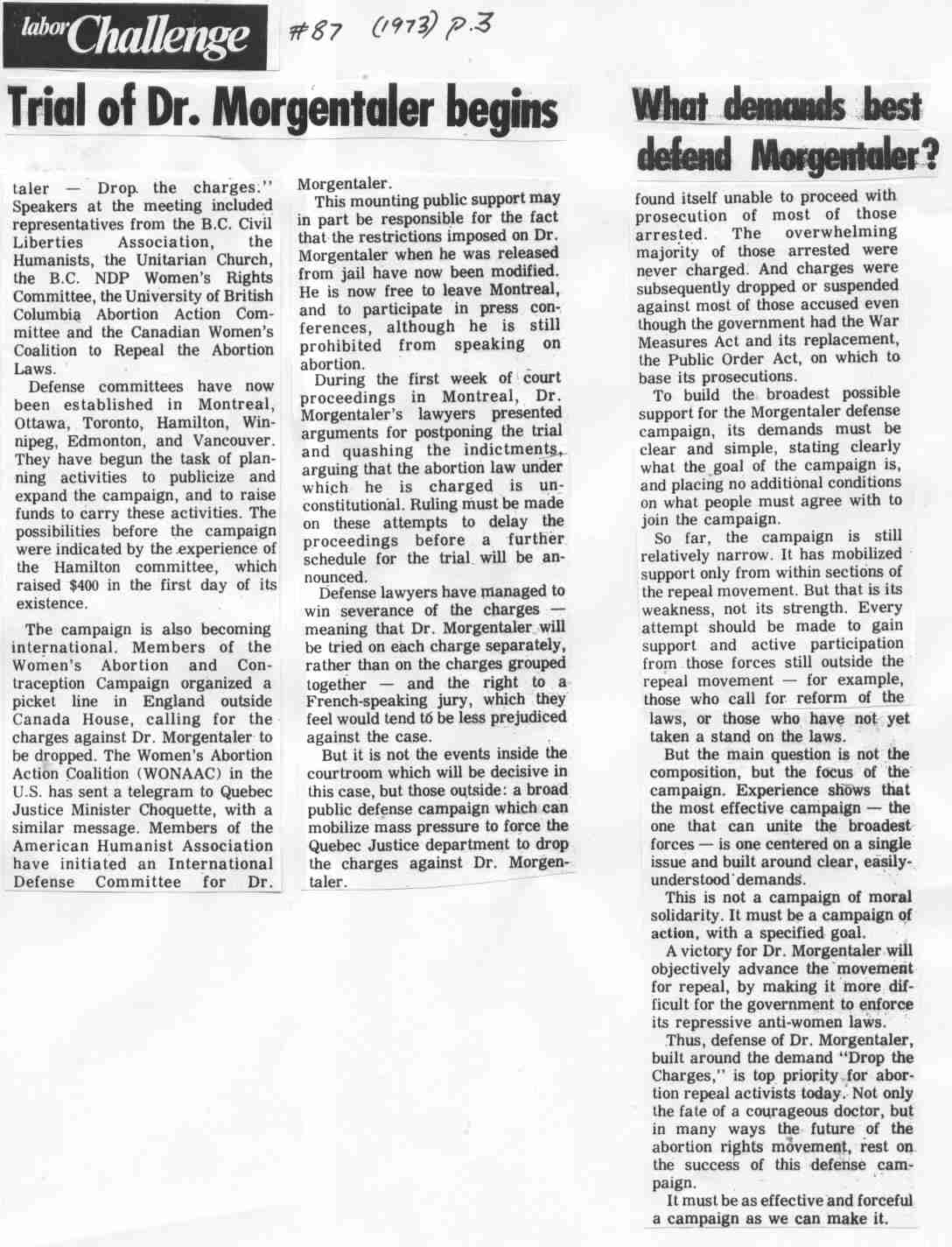 | #87 October: | Trial of Dr. Morgentaler begins; Rallies say ‘drop the charges,’ 2nd page by Lis Angus 3rd page What demands best defend Morgentaler? (Drop the charges), by Lis Angus |
