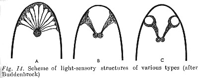 Light-sensitive cells are gathered together at the anterior end of the body later, for the first time, in worms (Fig. 14, A), and, on becoming concentrated acquire the form of plates (B); these organs already provide a possibility [p. 162] of quite precise orientation in the direction of light. Finally, at an even higher stage of evolution (mollusks), an internal, spherical light-sensitive cavity arises through bending of these plates, that operates like a camera lucida (C) that enables the movement of objects to be [sensed].