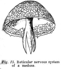 Originally the nervous system is a simple network the fibres of which running in various directions unite sensitive cells located on the surface directly with the animal's contractile tissue. This type of nervous system is not found in contemporary species. In jellyfish or medusae the nerve net leading from sensory cells is connected with muscular tissue already by means of motor nerve cells.