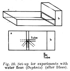 Water fleas (Daphnia) were pipetted and put into the tube; they quickly passed down the vertical part of the bend and began at once to move along the horizontal limb toward the light. On emerging from the tube they then swam freely to the illuminated wall of the tank. Their behaviour thus remained strictly controlled by the effect of light.