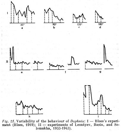 We know, for example, that most Daphnia possess positive [p. 170] phototropism, i.e. that they perform forced movements toward light. The behaviour of Daphnia, however, as the special experiments of Blees [(1919)] and of Soviet workers (Leontyev and Basin) have shown, in no way resembles the 'behaviour' of plant roots.