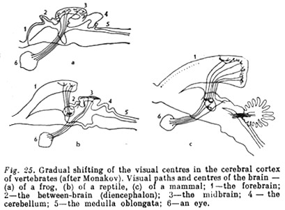 Vision, on the contrary, whose 'corticalisation' occurred initially with the reptiles, occupies a relatively ever greater place in the cortex (see Fig. 25). In birds the eyes become the main receptor (Fig. 24). Vision also plays the main role in many higher mammals.