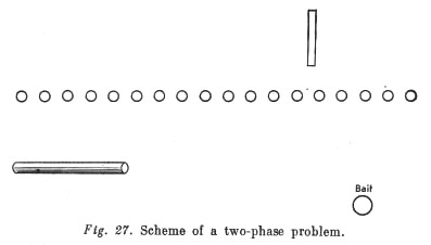 For example, bait is placed outside the cage in which the animal is housed, at a certain distance from it. Rather nearer to the cage but also beyond the animal's reach is a long stick. Another shorter stick that can reach the long one but not the bait is put into the cage. To solve this problem the ape must first pick up the short stick, draw the long stick to itself, and then pull the bait to it with the long stick (see Fig. 27). Apes usually cope with such 'two-phase' tasks without special difficulty. So a fourth feature of [their] intellectual activity consists in a capacity to solve two-phase tasks.