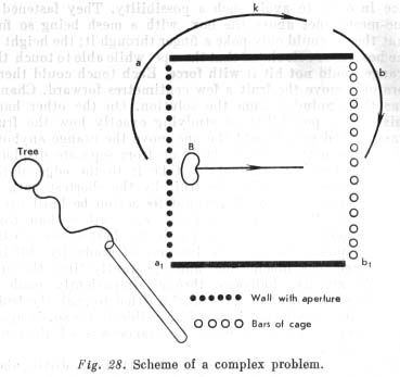 When an animal, in taking a roundabout method, first [p. 212] turns away from bait and only then seizes it, this complicated [two-phase action toward a goal] is governed by the spatial relations of the situation perceived by the animal; the first part of the path... presents the animal of necessity with the possibility of performing the second phase.
