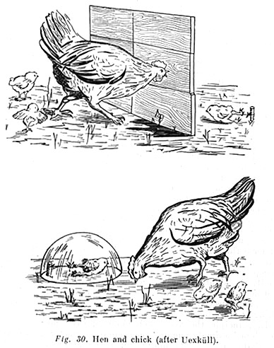 If, for instance, we pick a chick up and restrain it by force it begins to struggle and cheep; its cheep attracts the hen..., which rushes in the direction of the sound and responds... by a special kind of clucking. This vocal behaviour of a chick and hen is outwardly similar to oral communication [even in humans]. But the process is in fact of quite a different nature.... That can easily be confirmed by the following experiment: if we put the restrained chick, which continues to cheep, under a thick glass cover that deadens the sounds, the hen, which can distinctly see the chick but no longer hears its cheeping, ceases to display any activity whatsoever in regard to it; the sight of the struggling chick in itself leaves [the hen] indifferent. The hen thus reacts not to what the chick's cheeping objectively means, in this case to a danger threatening it, but to the sound of the cheeping (see Fig. 30).