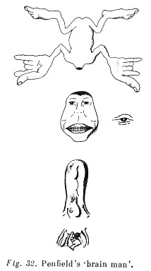 It is very clear how new, specifically human features are reflected in the structure of the cerebral cortex when what we call the projection motor area is investigated (area 4 in Fig. 31). When various points in this area are carefully [p. 206] stimulated by an electrical current, ...the contractions of various groups of muscles [are stimulated]... Penfield expressed the results... in the form of the schematic... drawing... (see Fig. 32). It is clear from this figure what a relatively big surface is occupied in the human brain by the projections of such motor organs as the hands, and especially by the organs of speech (the muscles of the mouth,tongue, and ... larynx), whose functions are developed... intensively in the conditions of human society (labour, speech communication).