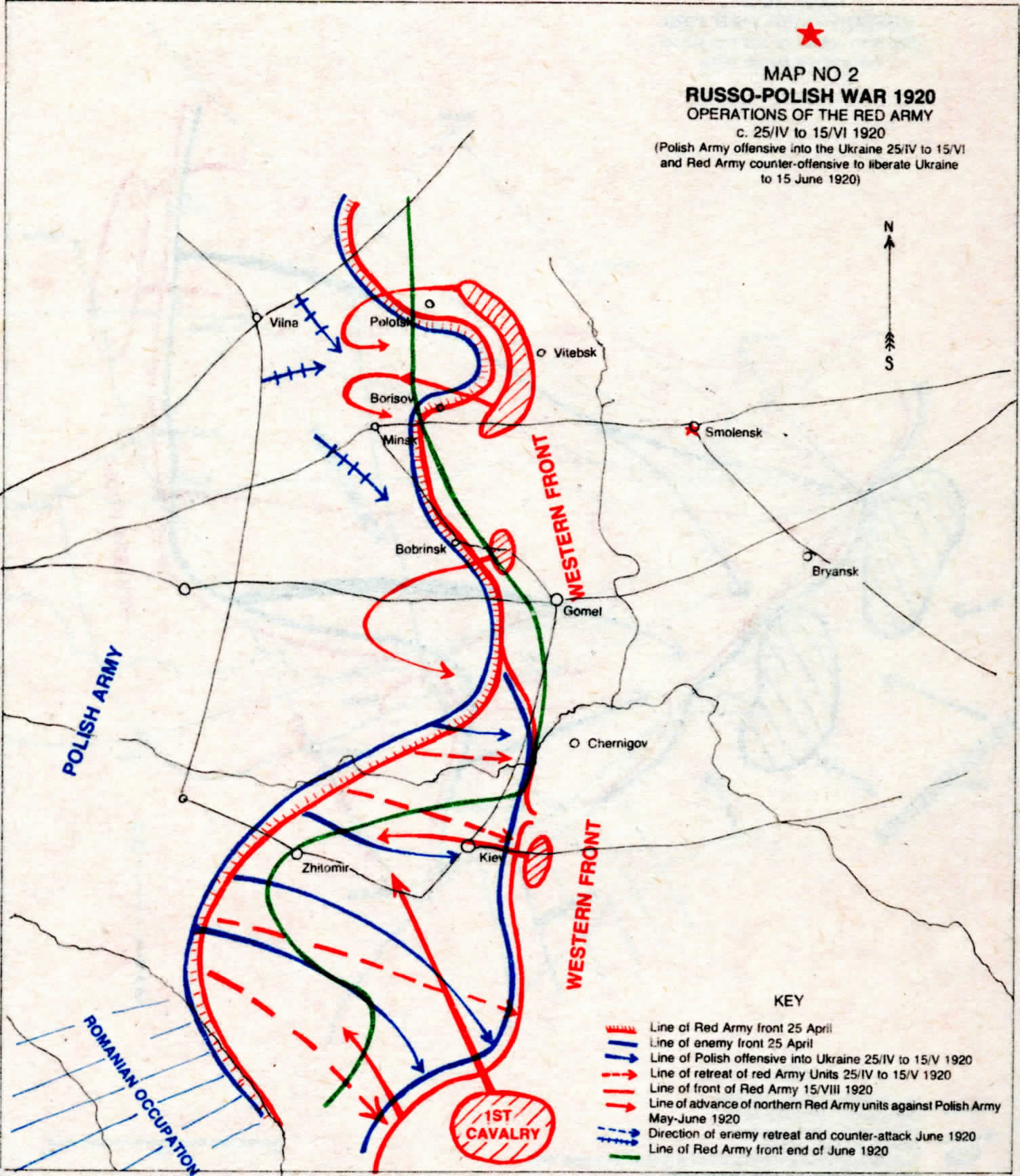 1. By order of the High Command and of the Government of the Soviet Republic, our units were forbidden to cross the lhie of the Byelorussian and Ukrainian front,which ran through Drissa, Disna, Polotsk, Borisov, Ptich, Chudnov, Pilyava and Bar. [Drissa, Disna and Polotsk are all on the Western Dvina, Borisov is on the Berezina, Ptich is north-west of Mozyr, Chudnov south-west of Zhitomir, Pilyava north-east of Proskurov, and Bar about 40km west-south-west of Vinnitsa.] This order was carefully obeyed by our forces before the Polish attack on the Ukraine.