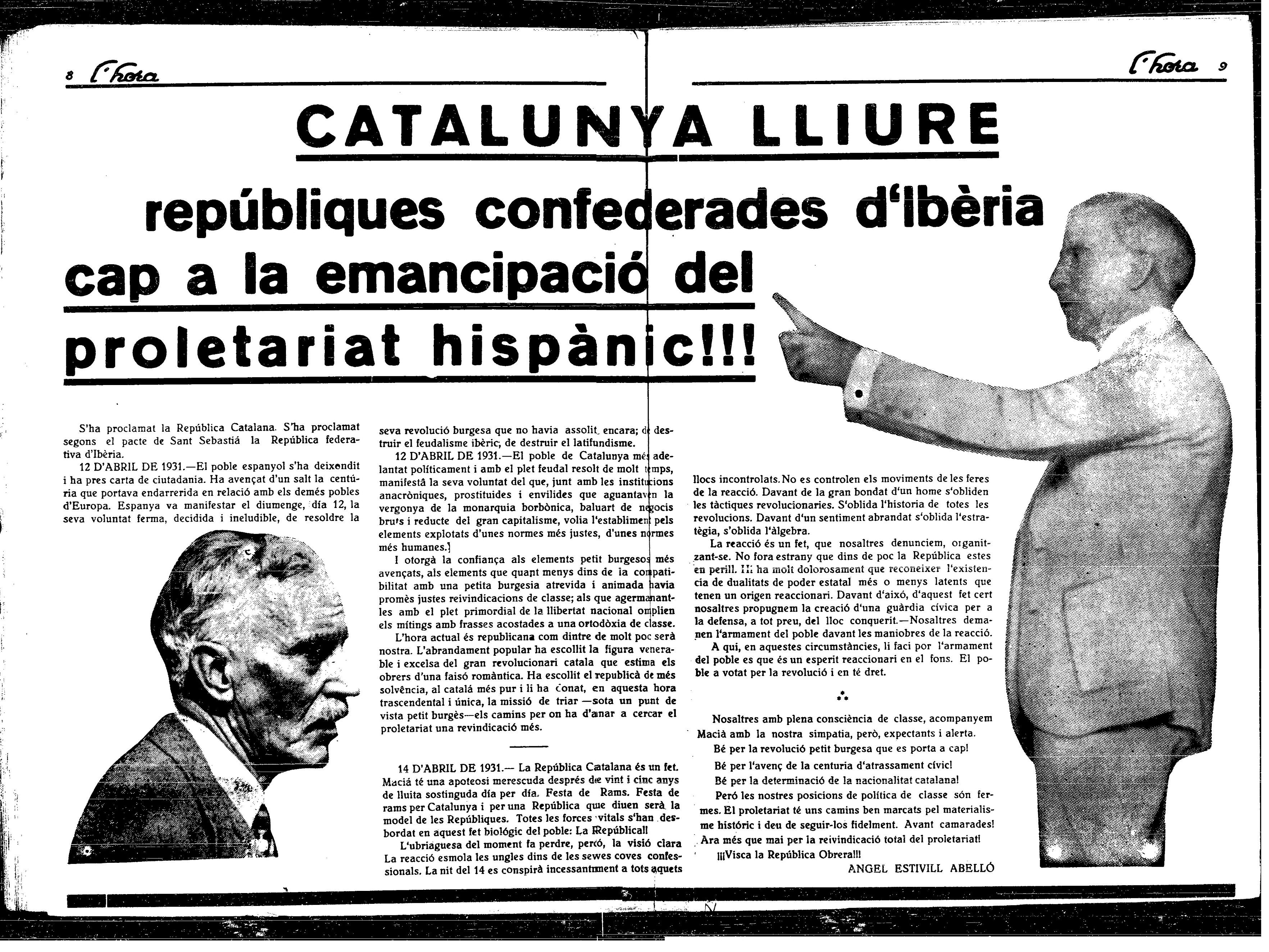 S’ha proclamat la República Catalana. S’ha proclamat, segons el pacte de Sant Sebastià, la República federativa d'Ibèria. 12 d'abril de 1931.—El poble espanyol s’ha deixondit i ha pres carta de ciutadania. Ha avançat d’un salt la centúria que portava endarrerida en relació amb els altres pobles d'Europa. Espanya va manifestar el diumenge, dia 12, la seva voluntat ferma, decidida i ineludible, de resoldre la seva revolució burgesa que no havia assolit encara; de destruir el feudalisme ibèric, de destruir el latifundisme. 12 d'abril de 1931.—El poble de Catalunya més adelantat políticament i amb el plet feudal resolt de molt temps, manifestà la seva voluntat que, junt amb les institucions anacròniques, prostituïdes i envilides que aguantaven la vergonya de la monarquia borbònica, baluard de negocis bruts i reducte del gran capitalisme, volia l’establiment pels elements explotats d’unes normes més justes, d’unes normes més humanes. I atorgà la confiança als elements petit burgesos més avençats, als elements que almenys dins de la compatibilitat amb una petita burgesia atrevida i animada havia promès justes reivindicacions de classe; als qui agermanant-les amb el plet primordial de la llibertat nacional omplien els mítings amb frases acostades a una ortodòxia de classe. L’hora actual és republicana com dintre de molt poc serà nostra. L’abrandament popular ha escollit la figura venerable i excelsa del gran revolucionari català que estima els obrers d’una faisó romàntica. Ha escollit el republicà de més solvència, el català més pur, i li ha donat, en aquesta hora transcendental i única, la missió de triar—sota un punt de vista petit burgès—els camins per on ha d’anar a cercar el proletariat una reivindicació més. 14 d'abril de 1931.—La República Catalana és un fet. Macià té una apoteosi merescuda després de vint-i-cinc anys de lluita sostinguda dia per dia. Festa de Rams. Festa de rams per a Catalunya i per a una República que diuen que serà la model de les Repúbliques. Totes les forces vitals s'han desbordat en aquest fet biològic del poble: la República! L’ubriaguesa del moment fa perdre, però, la visió clara. La reacció esmola les ungles dins de les seves coves confessionals. La nit del 14 es conspirà incessantment a tots aquests llocs incontrolats. No es controlen els moviments de les feres de la reacció. Davant de la gran bondat d'un home s'obliden les tàctiques revolucionàries. S’oblida la història de totes les revolucions. Davant d’un sentiment abrandat s’oblida l'estratègia, s’oblida l’àlgebra. La reacció és un fet, que nosaltres denunciem, organitzant-se. No fóra estrany que dins de poc la República estigués en perill. Molt dolorosament, cal reconèixer l’existència de dualitats de poder estatal més o menys latents que tenen un origen reaccionari. Davant d’això, d’aquest fet cert, nosaltres propugnem la creació d’una guàrdia cívica per a la defensa, a tot preu, del lloc conquerit.—Nosaltres demanem l’armament del poble davant les maniobres de la reacció. Qui, en aquestes circumstàncies, tingui por de l’armament del poble és que és un esperit reaccionari en el fons. El poble, ha votat per la revolució i en té dret. * * * Nosaltres amb plena consciència de classe, acompanyem Macià amb la nostra simpatia, però expectants i alerta. Bé per la revolució petit burgesa que es porta a cap! Bé per l’avenç de la centúria d’endarreriment cívic! Bé per la determinació de la nacionalitat catalana! Però les nostres posicions de política de classe són fermes. El proletariat té uns camins ben marcats pel materialisme històric i ha de seguir-los fidelment. Avant, camarades! Ara més que mai per la reivindicació total del proletariat! Visca la República Obrera!!! |