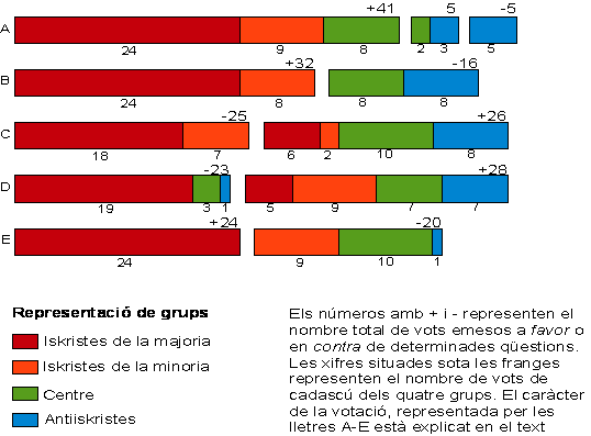 41Aquesta és precisament la votació que representa el diagrama B: els iskristes van obtenir-hi 32 vots i la resolució bundista 16. És d’advertir que no hi ha entre les votacions d’aquest tipus ni una sola votació nominal. Tan sols dos gèneres de dades ens indiquen, amb enorme grau de versemblança, la distribució de delegats: 1) en els debats, els oradors dels dos grups d’iskristes es declaren a favor, i en contra els oradors dels antiiskristes i del centre; 2) el nombre de vots “a favor” s’aproxima sempre molt a 33. Tampoc hem d’oblidar que en analitzar els debats del Congrés varem fer notar, també fora de les votacions, tota una sèrie de casos en què el “centre” es va unir als antiiskristes (als oportunistes) contra nosaltres, com va succeir en tractar-se del valor absolut de les reivindicacions democràtiques, del suport als elements oposicionistes, de la limitació del centralisme, etc.