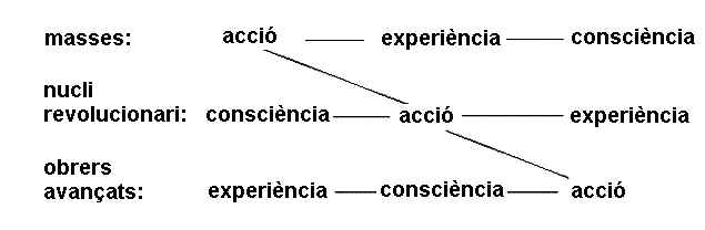 El partit segueix les mateixes lleis que el moviment de masses però amb un nivell qualitativament superior. La consciència del partit revolucionari no és més que l'experiència històrica del moviment obrer i de masses. Per comptes d'arrencar d'una consciència i experiència parcials i limitades, el partit arrenca de la consciència i experiència històriques i universal.s Per extreure-les, utilitza una sèrie de ciències combinades en una – el marxisme –, les eleva a consciència històrica, universal i abstracta, i la transforma en un programa polític marxista.