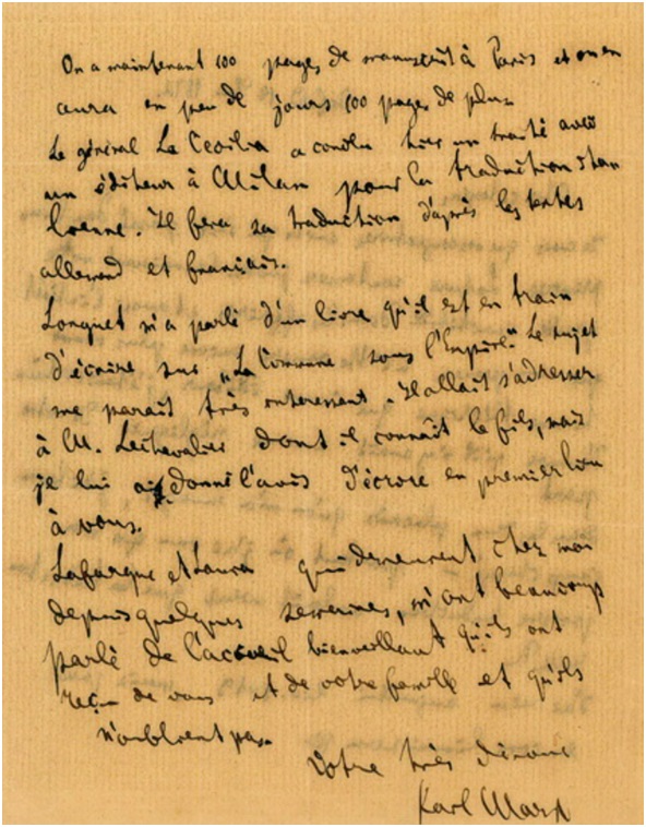 拉塞西利亚[2]将军昨天同米兰的一位出版商签订了出版意大利文版的合同。意大利文版将依据德文和法文文本翻译。