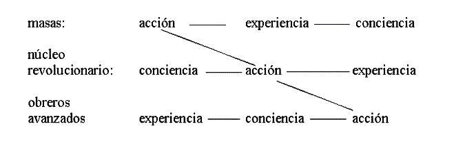 Del esquema mandeliano según el cual las masas, la vanguardia y el partido, recorren diferentes y difíciles caminos para llegar a la conciencia, a la acción o a la experiencia, ya hemos eliminado a la vanguardia, dado que por tratarse de un fenómeno su desarrollo no puede seguir ninguna secuencia previsible. Sólo faltaría agregar que, mientras cumple su papel de vanguardia, cualquier sector sigue en ese momento las mismas leyes de desarrollo que el propio movimiento de masas y el partido, aunque en forma contradictoria. Para los marxistas, "lo espontáneo es la forma embrionaria de lo consciente. Es decir que acción, experiencia y conciencia son partes de una totalidad que se da en todos los niveles, desde el partido hasta las masas. El elemento determinante de esa totalidad son las acciones del movimiento de masas.