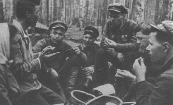 Los mandos guerrilleros (de derecha a izquierda): Yeriómenko, Korotkov, Nóvikov, Rostalny y Kúrochka recibiendo los partes de los enlaces del distrito de Koriukovka.