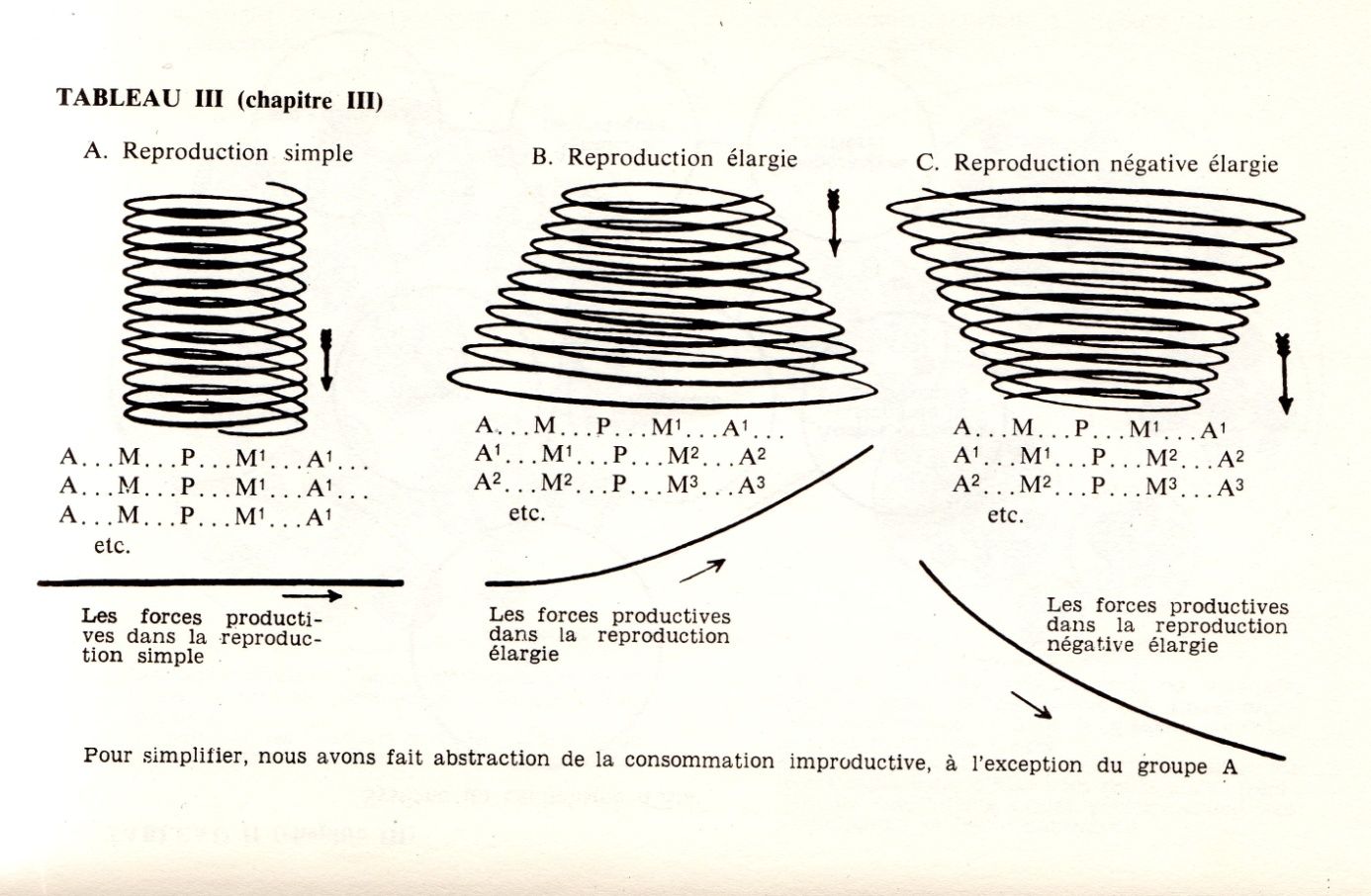 Le processus de reproduction n'est pas seulement un processus de reproduction des éléments matériels de la production, mais aussi un processus de reproduction des rapports de production eux-mêmes [l]. La reproduction élargie est la reproduction élargie des rapports de production donnés : leur champ, leur extension spatiale, deviennent toujours plus grands; la méthode de production donnée «s'étend» en se réorganisant dans ses détails internes; autrement dit, la reproduction des rapports capitalistes de production les reproduit fondamentalement dans la mesure où le rapport entre capital et travail salarié est maintenu et élargi en permanence. Mais à l'intérieur de ce rapport, les détails de la structure de production changent constamment; il suffit de mentionner la croissance de ce que l'on nomme la « nouvelle couche moyenne ». Que se passe-t-il lors de la reproduction élargie négative ? Pour répondre à cette question, il faut s'attarder plus en détail sur le problème de la structure sociale dans son ensemble.