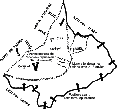 L'échec de la contre-offensive nationaliste va justifier les craintes des généraux italiens. Malgré l'accumulation du matériel, la supériorité de l'aviation, l'énorme densité de l'artillerie[3], la violence des assauts enfin, une partie seulement des objectifs sont atteints. Au début, on a obtenu quelques résultats: le 20° corps républicain a reculé en désordre. Les troupes d'Aranda ont progressé en direction de Teruel et repris la Muela; ils dominent la ville et sont à ce point certains de la prendre que la radio nationaliste annonce que c'est chose faite. Pourtant, début Janvier, une nouvelle ligne de front s'est dessinée: elle ne subira pratiquement aucun changement pendant un mois.