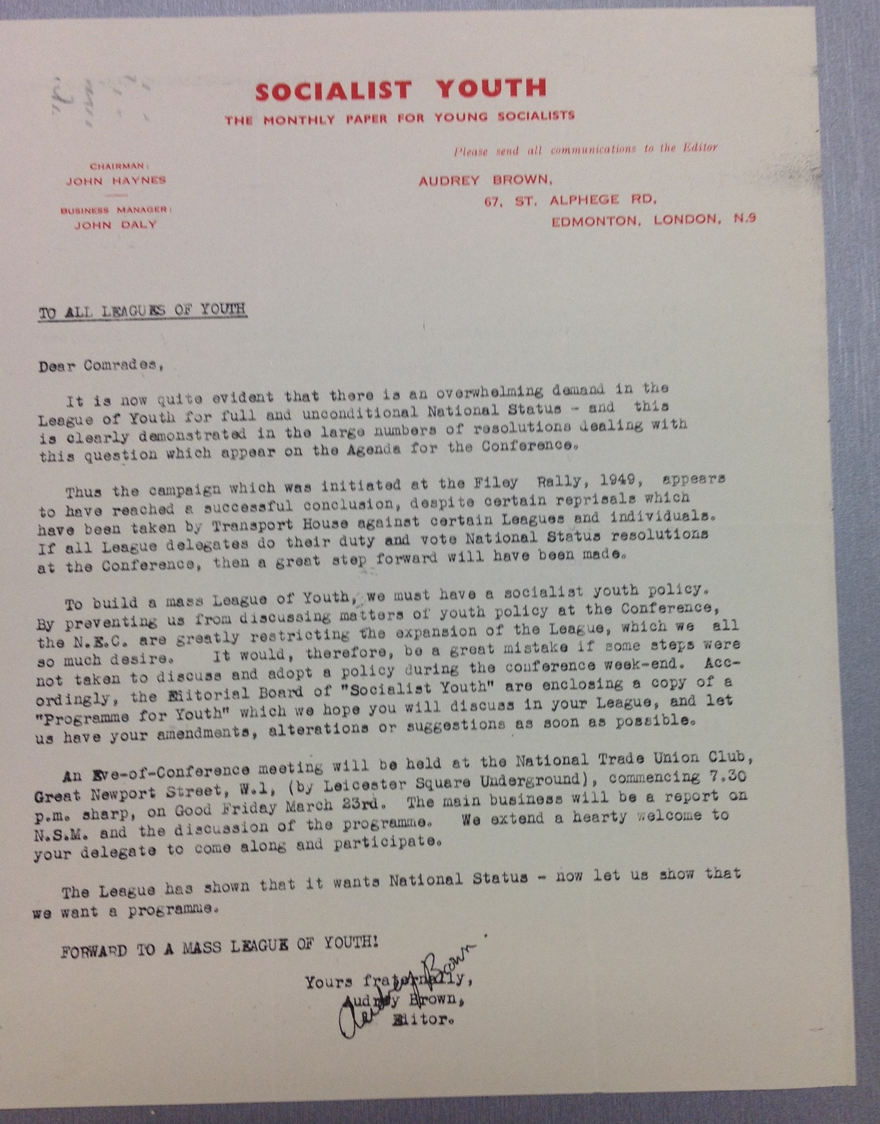 Keep Left was the newspaper of the youth organized in support of the Socialist Labour League in Britain operating, initially, inside the Labour Party. Given that almost 60% of the founding members of the Socialist Revolution Group were also Labour League of Youth (LLOY) members and, indeed, one of these (Jeanne Hoban) was on its 22-person National Consultative Committee, the decision to set up a youth paper is not surprising. Neither is the organisational method surprising as LLOY branches in different locations already produced their own publications. In this respect it should be noted that amongst the other Trotskyist remnants of the recently deceased Revolutionary Communist Party, the Grant-Deane tendency had a base in Liverpool and had acquired control of the Birkenhead LLOY publication Rally [Rally = Read About the Labour League of Youth]. Rally had been produced since September 1949 and as at October 1950 (Vol. 2 No. 4) it was a professionally produced and presented 16-page publication. The Healy Group published the first issue of its own youth paper Socialist Youth at the end of 1950. It was professionally printed and in newspaper format. Of interest, but no particular significance, is the fact that the Healyite paper was published by Audrey Brown of Edmonton LLOY. Audrey Brown had been a member of the “Club” since her schooldays in Newcastle and was later better known as the Labour MP Audrey Wise. Coincidentally, November 1950 also saw issue number 1 of Keep Left. This was a roughly typed and duplicated “magazine” produced by “the combined Wembley Labour Leagues of Youth” – a small beginning from which something larger was to grow.