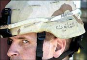 U.S. Soldier with the words I Am the Law written in Arabic on his helmet.