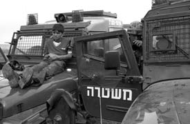 Palastinian boy secured to the hood and used as a human shield by the Israeli Defense Forces.