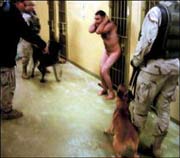 A naked Iraqi detainee cowering under threat from two American military dogs in the infamous Abu Ghraib prison outside Baghdad.
