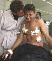 Ahmed Jabar, 15, gets a kiss from his brother in the Al Hakim hospital in Naja, Iraq, Sunday, May 9, 2004. Ahmed was injured when clashes occurred between U.S. and militia forces in the industrial area of Najaf. (AP Photo/Hadi Mizban)