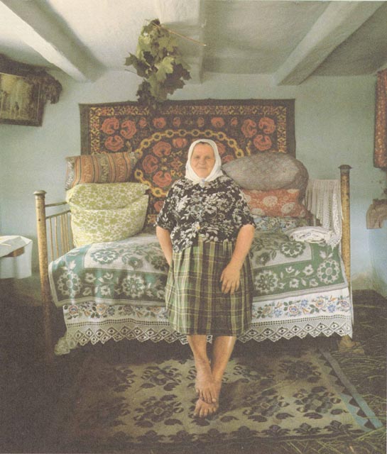 | A proud farmer displays her bedroom. Note the branch on the sealing, and the grass on the floor — the traditional way of observing the pentecost. (circa 1980s) |