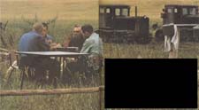 | Workers on a collective farm break for a relaxed lunch. In the background, their DT-75M tractors rest. (circa 1980s) |