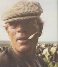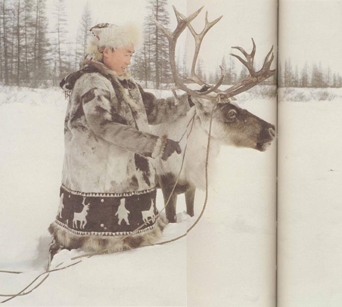 | A Nenets collective herder tends to a reindeer. The collective farm he worked on held over 17,000 animals, and produced 350 tons of reindeer meat every year.(circa 1980s) |