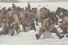 | Fishing on a frozen lake, these ice-fishers are on their sweet spot. (circa 1980s) |
