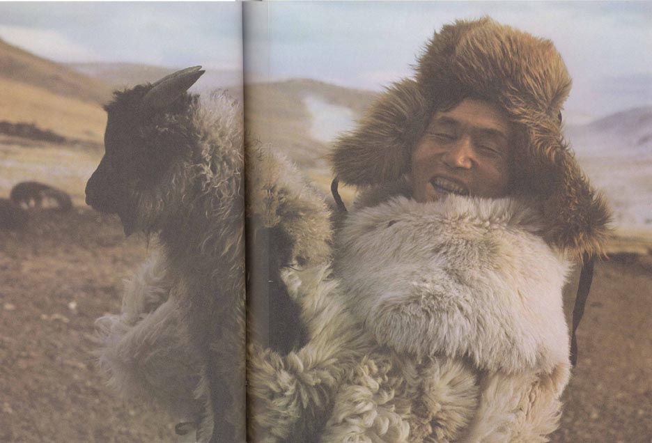 | A happy mongol worker of the Kosh-Agach region holds up a goat that he uses as breeding stock for its fleece.(circa 1980s) |