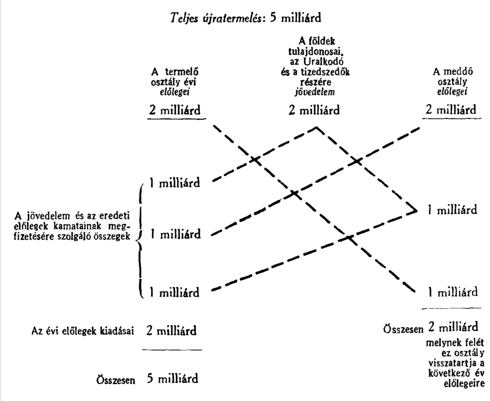 Az egész folyamat valóban „meglehetősen egyszerű”. A forgalomba vetettek: a bérlők két milliárd pénzt, a járadék fizetésére, és három milliárdért termékeket, melyeknek kétharmada létfenntartási eszköz és egyharmada nyersanyag; a meddő osztály pedig két milliárdért manufaktúra-árukat. A két milliárd összegű létfenntartási eszközöknek az egyik felét a földtulajdonosok meg a függelékük fogyasztják el, a másikat munkája fizetségében a meddő osztály. Az egy milliárdért való nyersanyagok ugyanezen osztály üzemi tőkéjét pótolják. A forgalomban levő két milliárd összegű manufaktúra-áruknak az egyik fele a földtulajdonosoknak jut, a másik a bérlőknek, akik számára ez csak átváltozott formája az — első kézből a mezőgazdasági újratermelésből nyert — kamatnak a befektetett tőkéjükre. A pénz pedig, melyet a bérlő a járadék fizetésével a forgalomba dobott, termékeinek eladása révén visszaáramlik hozzá, és így ugyanezt a körforgást a legközelebbi gazdasági évben újra be lehet futni.