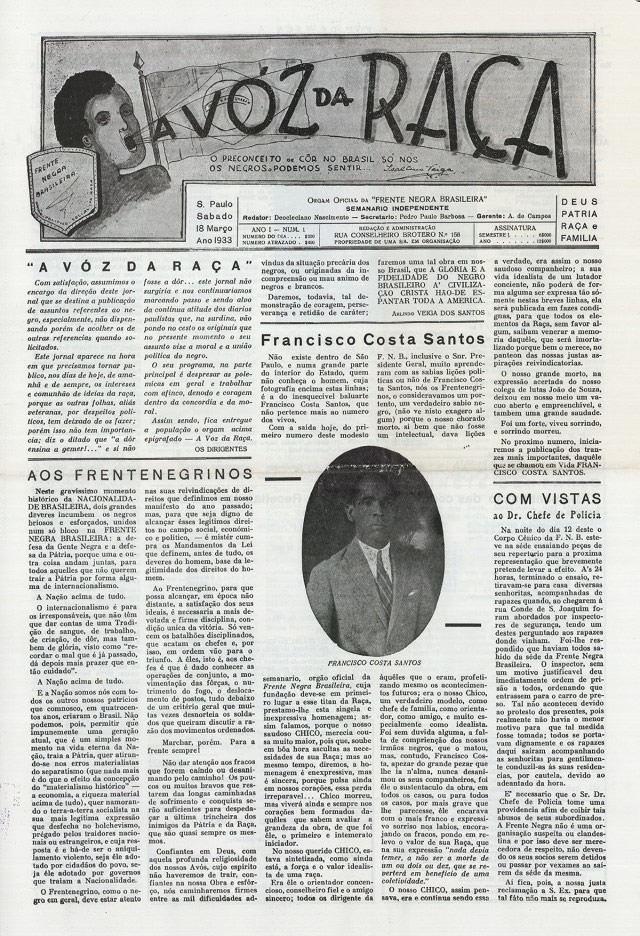 Imagem: capa do primeiro número do jornal da entidade: “A Voz da Raça”. Clique na imagem para ampliar.