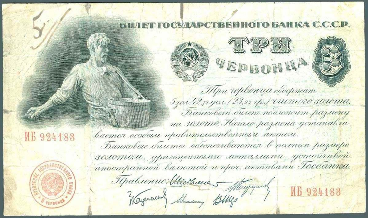 Imagem: Nota de três Tchervónets emitida em 1924. Clique na imagem para ampliar.