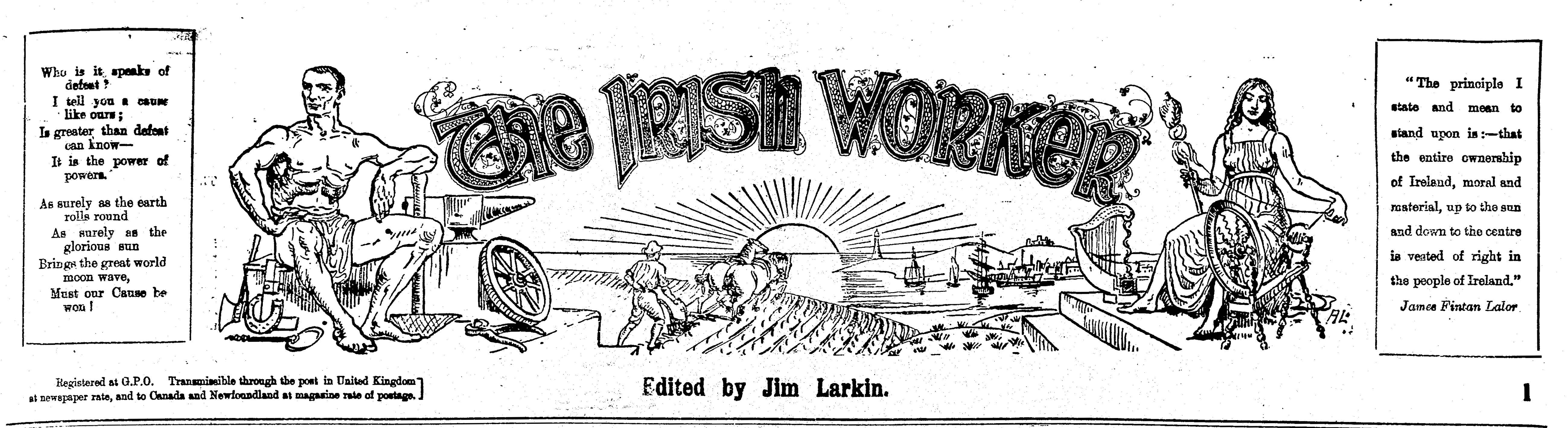 The Irish Worker and People’s Advocate newspaper (after six months it would be called simply The Irish Worker) was launched on 27 May 1911 by the outstanding Irish revolutionary and labour leader James Larkin. Taken up by the Irish Transport and General Workers Union, the weekly paper would become a landmark publication in the history of the Irish labour press. With its vigorous style and large circulation the paper became the outstanding voice of the Irish labour movement.