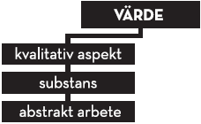 I Marx terminologi är dessa produkter av abstrakt arbete värden. Precis som varor är bruksvärden och bytesvärden när de har något gemensamt, är de också värden när de har ett värde. Men att säga att en vara har ett värde innebär inte en subjektiv värdering. Det innebär bara kort uttryckt att den är en produkt av abstrakt arbete och att den kommer att bytas. Ett annat sätt att uttrycka relationen mellan värde och abstrakt arbete är att säga att värdets substans är abstrakt arbete. Som vi kommer att se kan värdets kvantitet vara större eller mindre, men det är här fråga om måttet på dess väsentliga kvalitet eller substans: abstrakt arbete. På samma sätt kan värdets substans komma till mer eller mindre fullständigt uttryck genom olika former av bytesvärde. Dess form och mått är nödvändiga för värdet, men båda måste skiljas från substansen. Låt oss därför slå fast: att värdet är bytesvärdets kvalitativa aspekt innebär inte att det bara är fråga om en kvalitet. Abstrakt arbete är värdets essens - det som inte kan ändras med mindre än att begreppet går förlorat. Abstrakt arbete utgör substansen, eller essensen, av värdeformen: bytesvärde. Omvänt säger Marx att bytesvärdet är värdets fenomenella form (eller framträdelseform) - den form genom vilken värdet tar sig ett igenkännbart uttryck i kapitalet. Med andra ord: arbete har för kapitalet endast mening, och framträder som en samhällelig relation endast när det förkroppsligas i en produkt som utbyts (och som i bästa fall skapar mervärde).