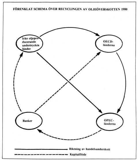 Med fördubblingen av oljepriset har de icke oljeproducerande beroende länderna, vars betalningsbalanser redan tidigare varje år uppvisade ett underskott på ett tiotal miljarder dollar, fått se sitt underskott fördubblas 1974 för att nå omkring 70 miljarder dollar 1980. De icke oljeexporterande beroende ländernas totala utlandsskuld överstiger för närvarande 330 miljarder dollar. Beviljandet av sådana belopp kan förklaras av åtminstone tre orsaker.